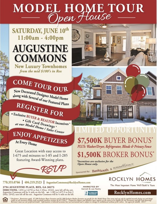 Dreaming of a new home? Augustine Commons, located in Rex, GA in Clayton County is hosting a Model Home Tour Open House on Saturday June 10th between 11:00 am and 4:00 pm.